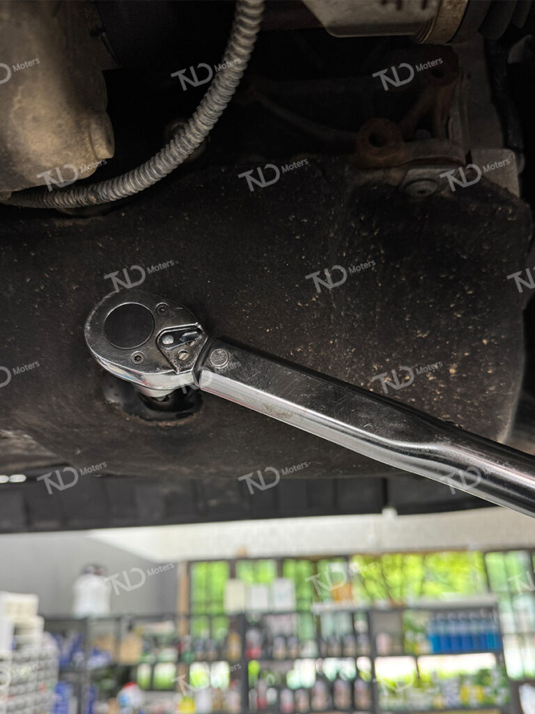 엔진오일 배출이 완료된 후 토크렌치를 사용하여 제조사에서 권장하는 규정 토크 값으로 체결합니다