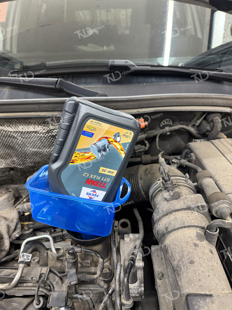 TITAN GT1 FLEX C2 SAE 0W-30 엔진오일을 정량에 맞춰 주입합니다