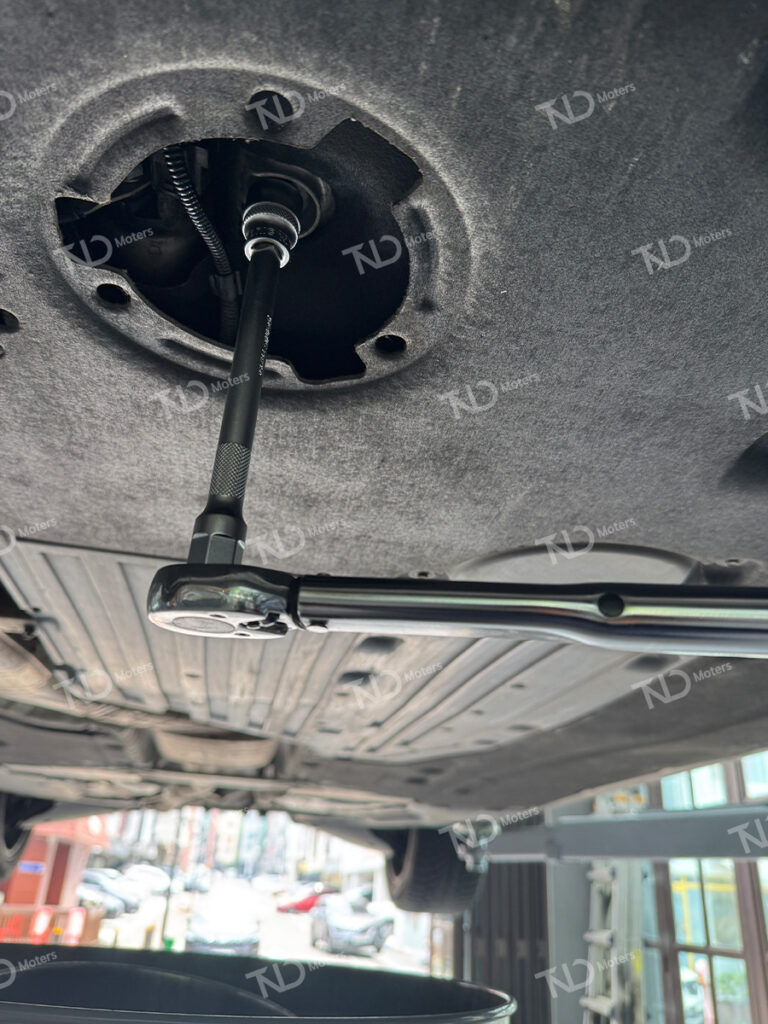 엔진오일 교환을 진행해 줍니다.드레인 플러그를 탈거하여 기존의 오일을 모두 배출합니다엔진 내부에 수분이 유입될 수 있기에 충분한 시간을 가져자유낙하 방식의 드레인 방법을 채택하고 있습니다엔진오일 배출이 완료된 후 토크렌치를 사용하여 제조사에서 권장하는 규정 토크 값으로 체결합니다
