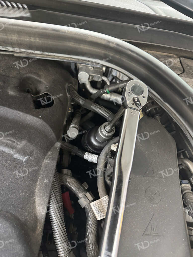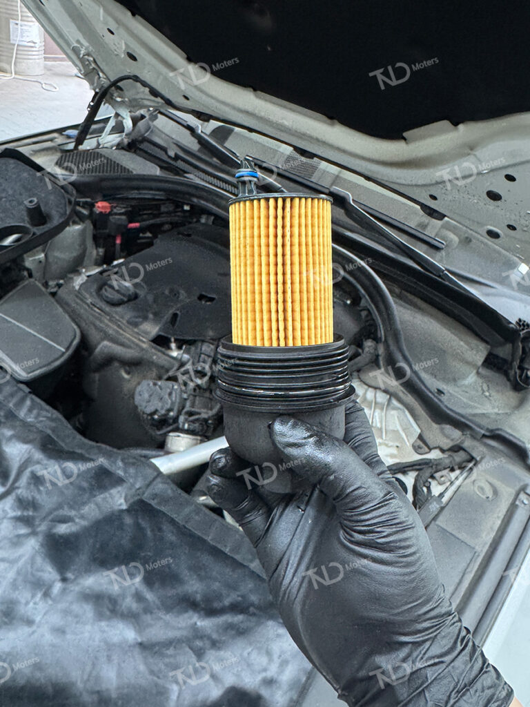 기존의 엔진오일이 모두 배출이 완료된 후 엔진오일 필터를 교체합니다엔진오일 필터 역시 교체 후 토크렌치를 사용하여 제조사에서 권장하는 규정 토크 값으로 체결합니다