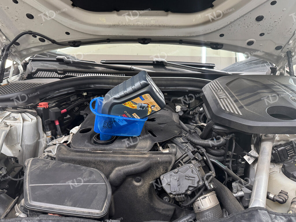 다음으로 새로 주입될 TITAN GT1 FLEX C2 SAE 0W-30 엔진오일을 정량에 맞춰 주입합니다