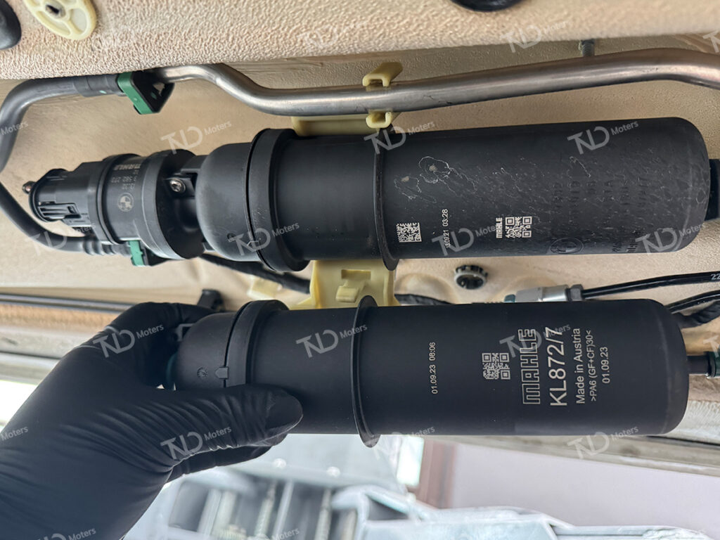 엔진오일 교체 작업이 완료된 후 연료필터 교체를 위해연료필터 하우징에서 필터를 탈거 후 신품 필터로 교체합니다.연료필터를 교체 시기에 맞게 관리를 해주셔야 펌프에서 발생되는 쇳가루를 방지할 수 있습니다