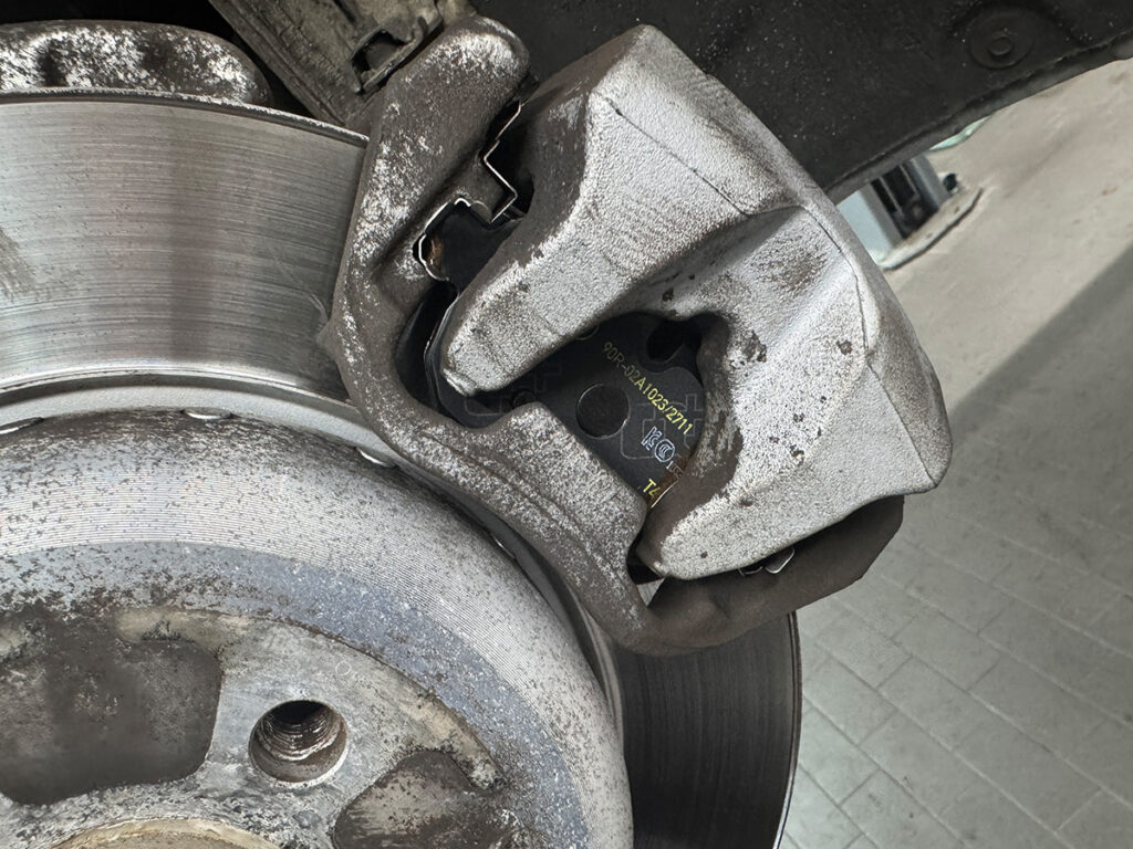 브레이크 패드 교체 알람 시 브레이크 패드의 잔량은 약 3~4mm 정도이며약 5,000km 이내로 교체를 진행해 주시는 것을 권장 드립니다브레이크 패드 교체를 위해 기존의 브레이크 패드를 탈거합니다