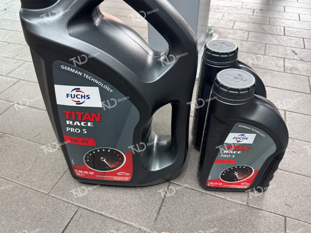 배출이 완료된 후 새롭게 주입되는 오일은 Fuchs TITAN Race Pro S 0W-40 엔진오일입니다.